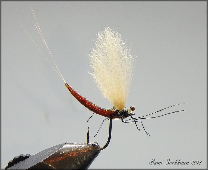 Kiitos, koukku on Mustad R50 joka on muokattu.. Eli käänsin n.5mm matkalta 90 asteen kulmaan jonka jälkeen sytkärillä lämmitin koukun silmän ja suoristin senkin.