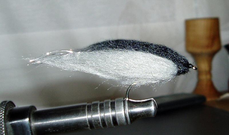 Tuota tuota... ostapas valkoista kettua ja ice blue (tai jotain helmiäis)wing´n flashia ja rakenna niistä tuohon siipi ja pään voi vaikka tehdä ihan mustasta villasta tai antronista. Tulee ihan nätti perho. En osaa sanoa mitään tuon villan elävyydestä, että elääkö se vedessä, vai miten...