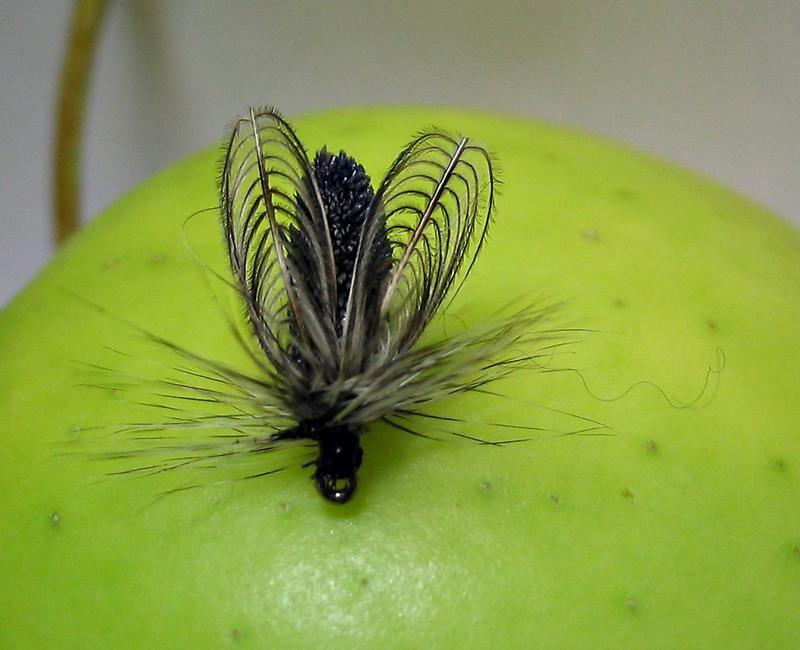 Äsken kehittelemäni yksinkertainen kärpäs-imitaatio. Näyttää mielestäni ihan toimivalta (menee kaloille varmaan myös paarmasta).