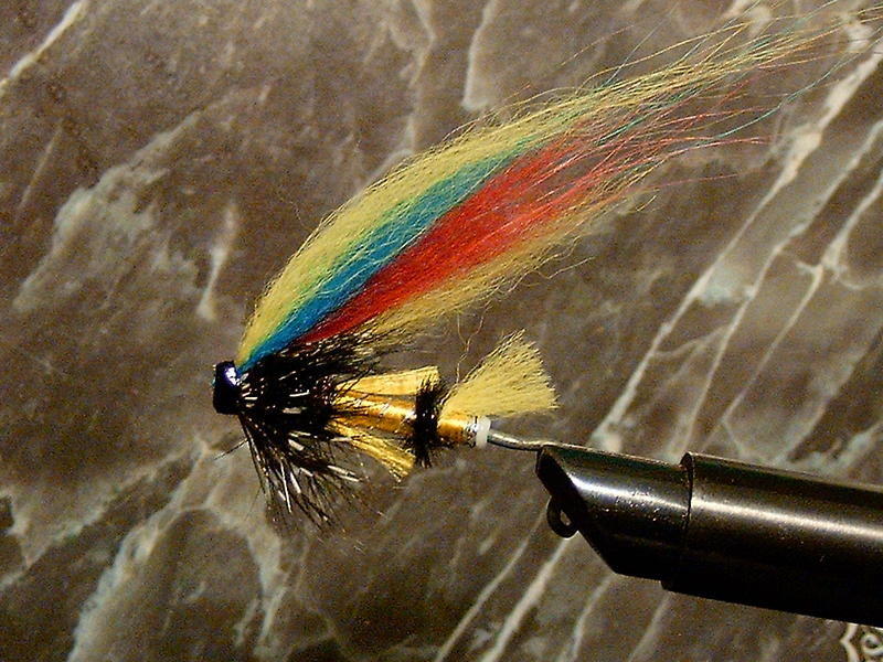 Kettusiipinen putkiperhoversio Jock Scott lohiperhosta.