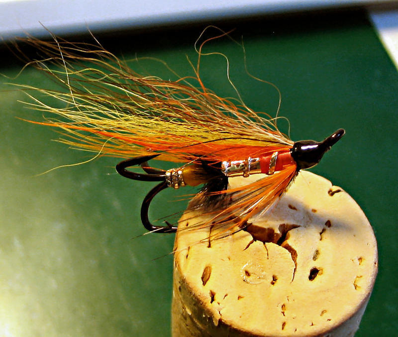 Mulla kävi iso lohi Simojoella perhoon, jossa oli täsmälleen samanlainen siipi kuin tässä, runkokin lähes samanlainen, mutta hopean tilalla keltainen silkki. Koukku oli 1-haara.