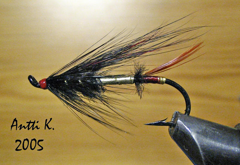 Jotenkin perho näyttää pohjoisen jokien ottipelille. Jälleen tietty joesta riippuu lisäisinkö siihen jotain kirkasta siipeen tai tuonne siiven tyveen. Onkohan perän punainen silkki viininpunainen? Aina kuitenkin tärkeintä on perhon käyttäjän mieltymys, itse lisäisin siipeen AngelHair kulta hologrammia pari säiettä.