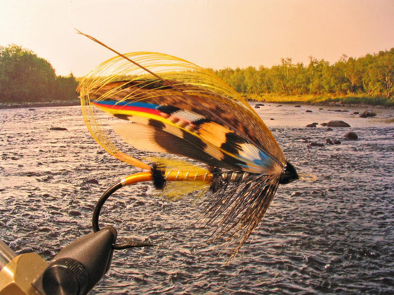Klassinen Jock Scott, jonka hunnut on korvattu keltaisilla cdc-höyhenillä.