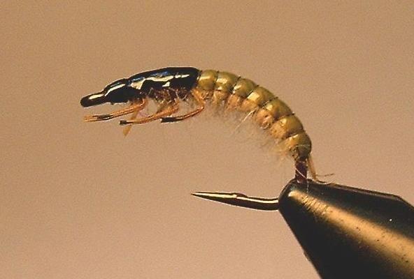 Melko realistinen larva-jäljitelmä. Takaruumiin materiaalia omaavilla perhoilla on noussut ennenkin kalaa, mutta ihan tästä mallista ei ole kokemuksia. Tuolla koukulla kelpaa vaikka lähteä Tenolle! ;)
