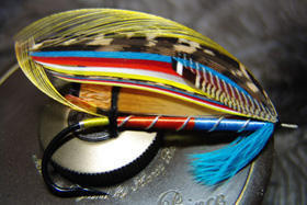 Toisessa nimessä pisteen jälkeen taitaa olla väli. Perho on hieno ja niin kuin edellä mainittiin runko on taisainen. En sitten tiedä kyseisestä perhosta, taitaa olla alkuperäinen, johon ei välttämättä kuulu runkohäkilää, mutta minustakin näyttäisi ehkä paremmalta runkohäkilän kanssa. Kuva on vähän epäselvä kun on noin pieneksi jäänyt, mutta pääpiirteet saa selville. Kierre näyttäisi olevan aika paksua, ainakin minun mielestäni. Minäkin yrittäisin tehdä päästä vähän isomman. Varmasti kalastava perho jos tarjotaan lohelle.
